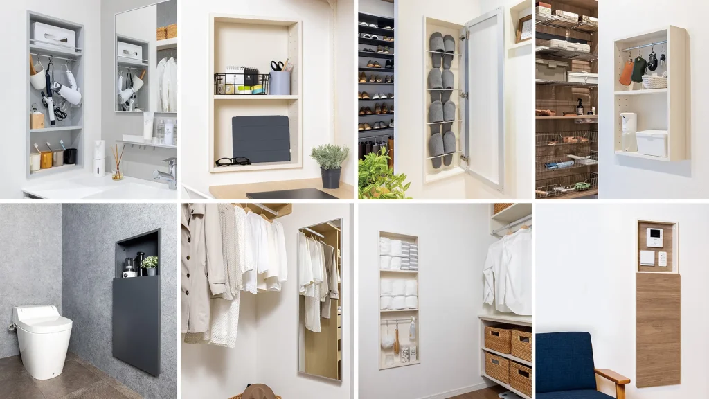 - **ウォールシェルフ(飾り棚)**を設置し、見せる収納として活用します。